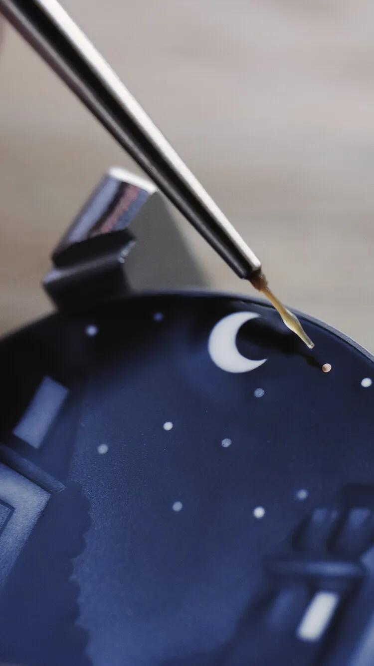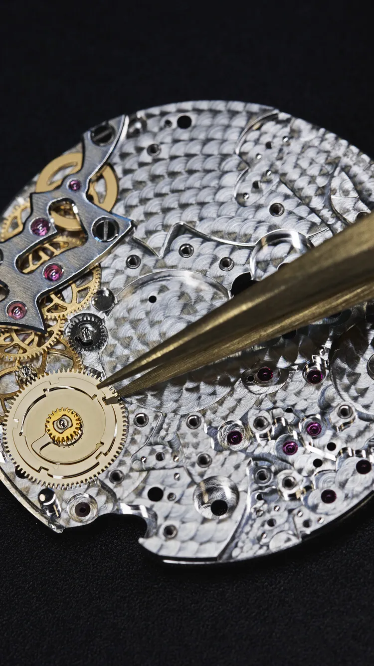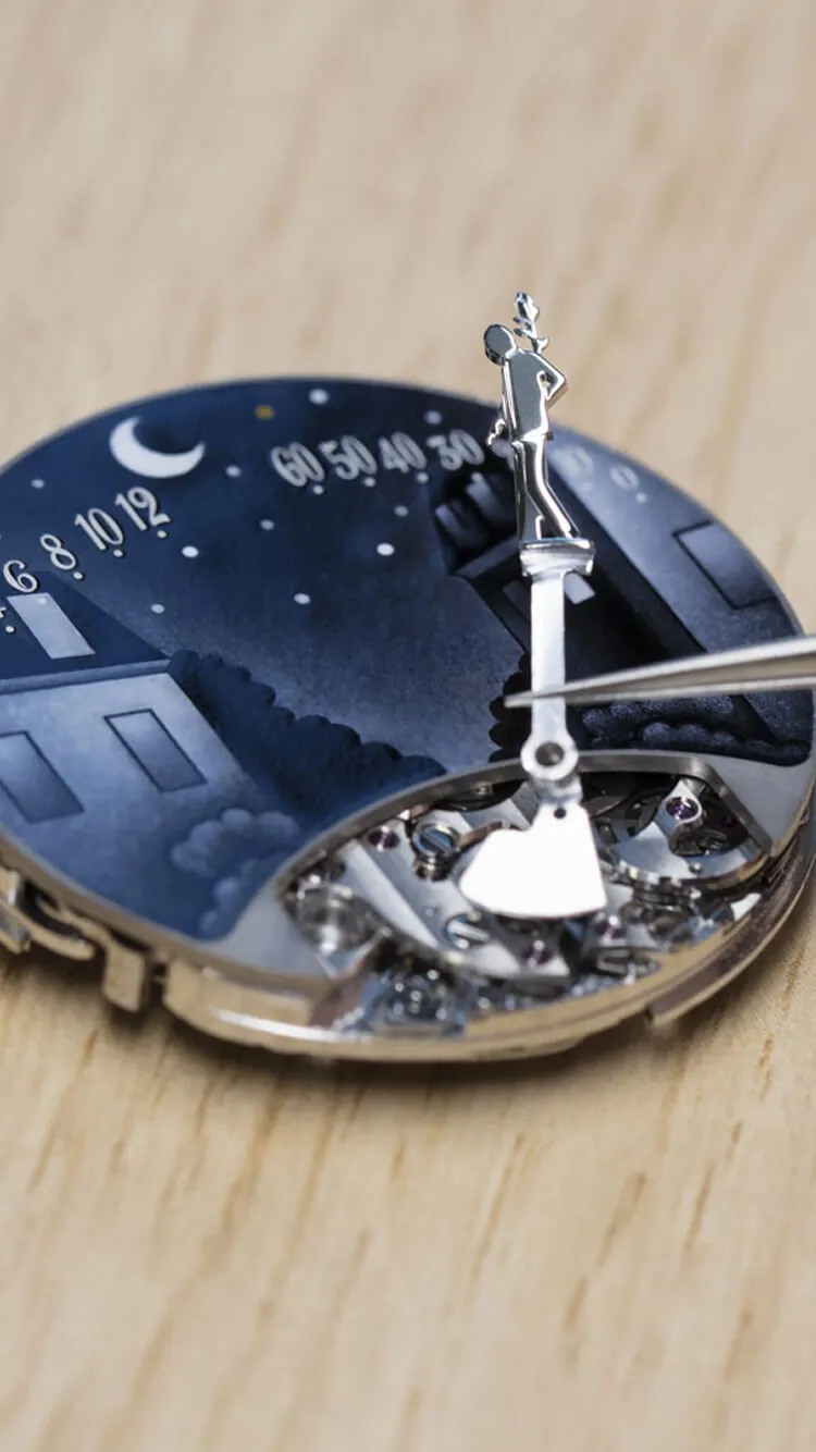 ذهب أبيض عيار 18 قيراط مطلي بالروديوم، ماس، مينا، حركة ميكانيكية ذات تعبئة أوتوماتيكية، حركة ارتجاعية وتفعيل عند الطلب