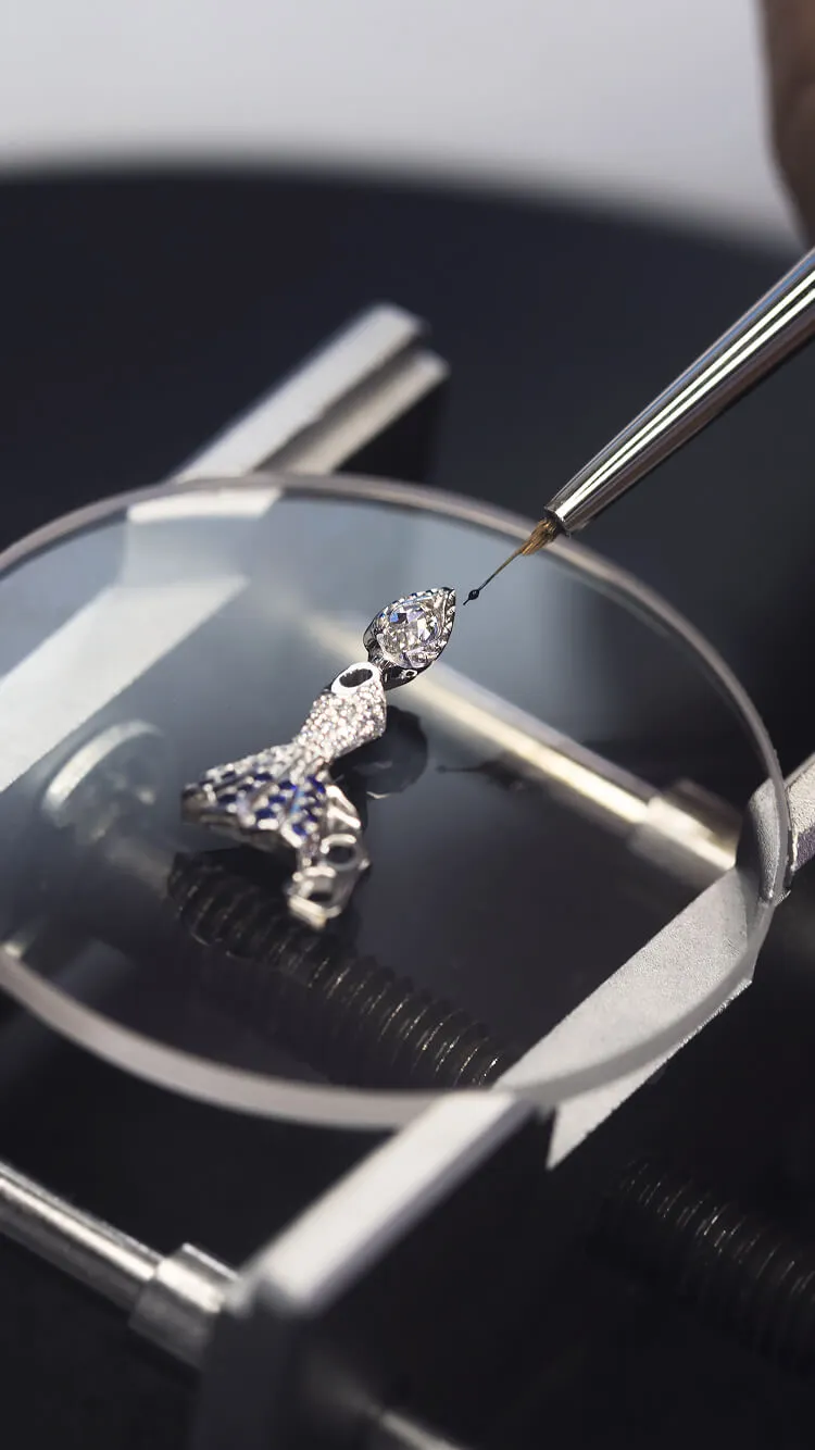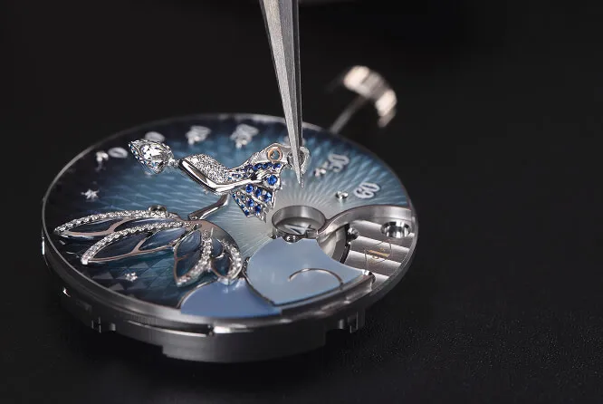 وتحرس الحورية التي تعتبر مصدراً حقيقياً للحماية والأنوثة في فستانها من السافير والماس، مرور الوقت. تحاكي جناحيها المصنوعة من مينا بليك أجور الفيروزي ظلال السماء المرصعة بالنجوم من عرق اللؤلؤ بزخرفة غيوشيه والمرصعة بالماس. تشير إلى الدقائق بعصاها السحرية بفضل الحركة الإرتجاعية وهي جالسة برقة على سحابة. حيث يشير القمر إلى الساعات من خلال نافذة من عرق اللؤلؤ مزينة بهالة تتوهج بلطف وهدوء.