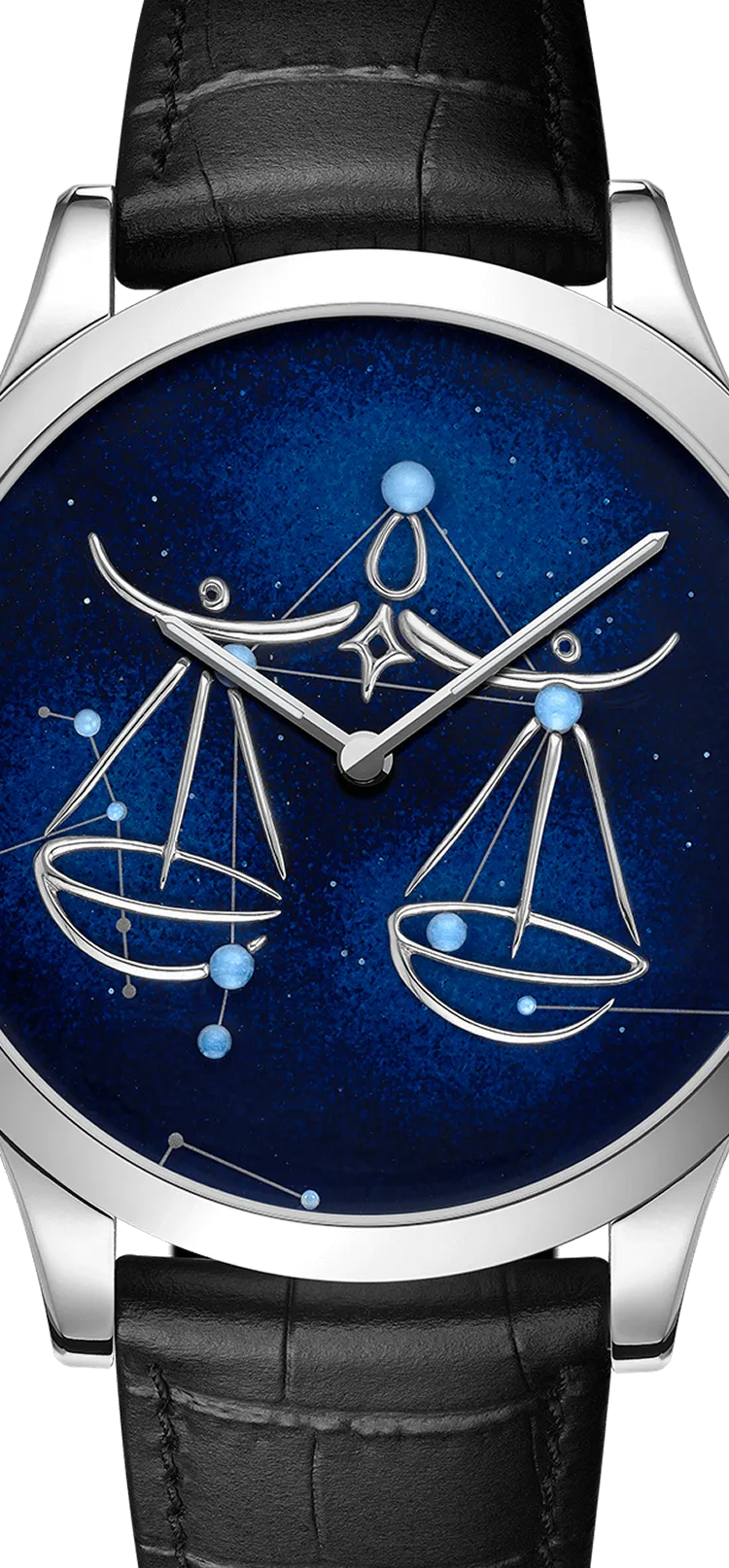 في دعوة لمواكبة إيقاع الكون، تعيد مجموعة ميدنايت زودياك لومينو إحياء مشهد النجوم من خلال 12 ساعة تتميز بوحدة إضاءة حصرية عند الطلب. يصور لذهب الأبيض المنحوت بدقة علامات الأبراج التي تتباين مع خلفية من المينا الزرقاء المتلألئة، محاكيةً القبة السماوية.