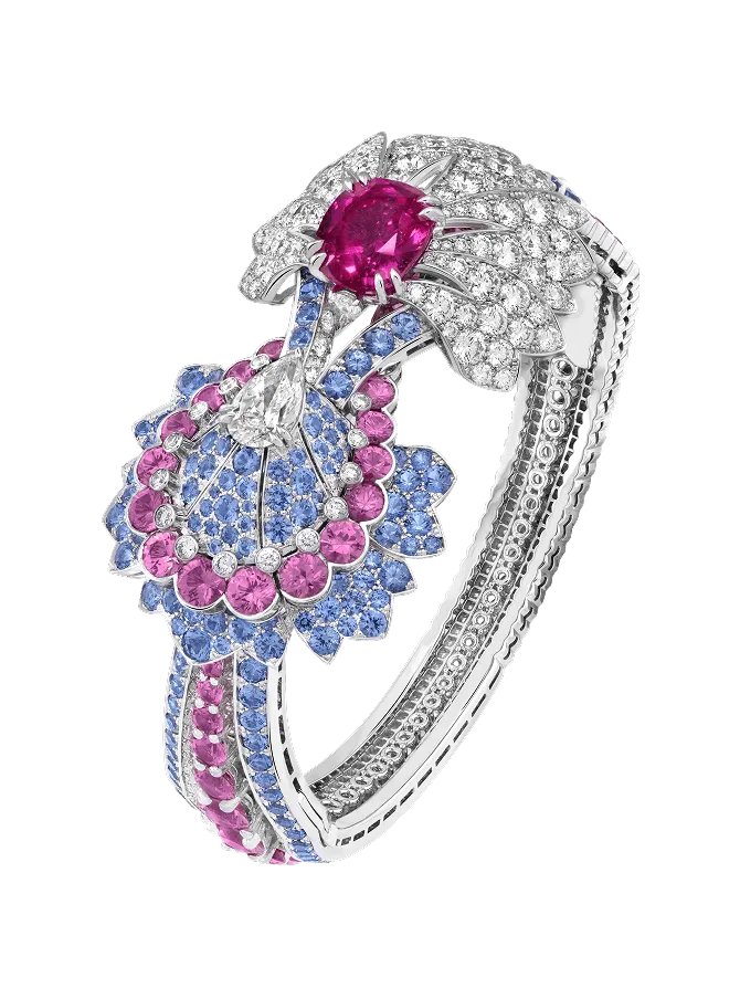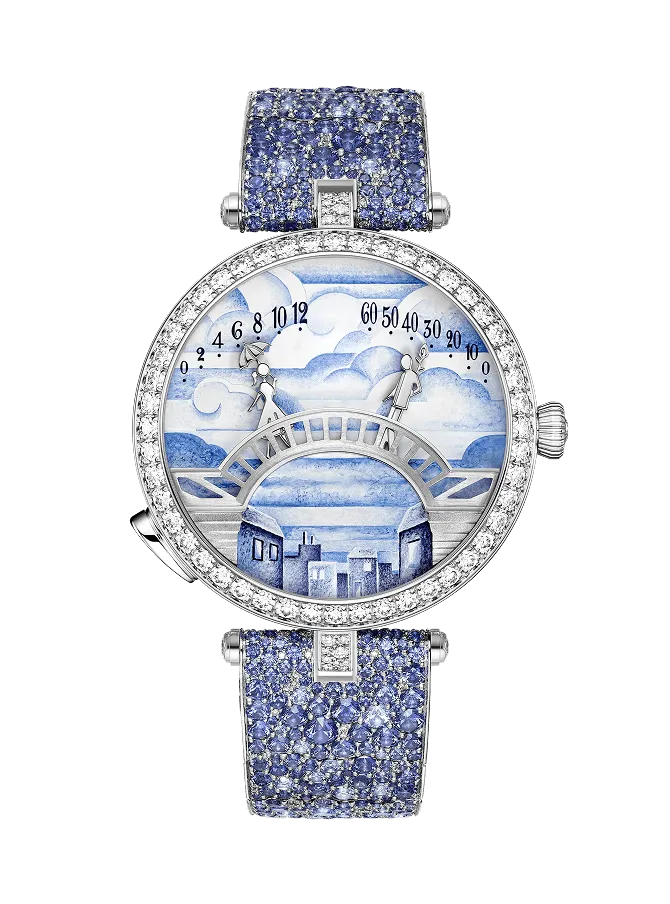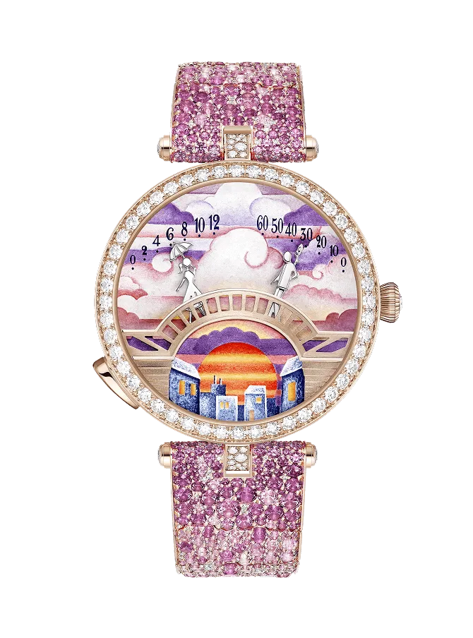 在 Lady Arpels Pont des Amoureux 腕錶填上墨彩琺瑯