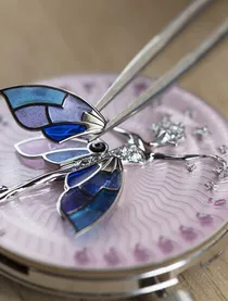 錶盤上的仙子擁有玫瑰形切割鑽石臉龐和空靈的翅膀,象徵著喜悅與希望