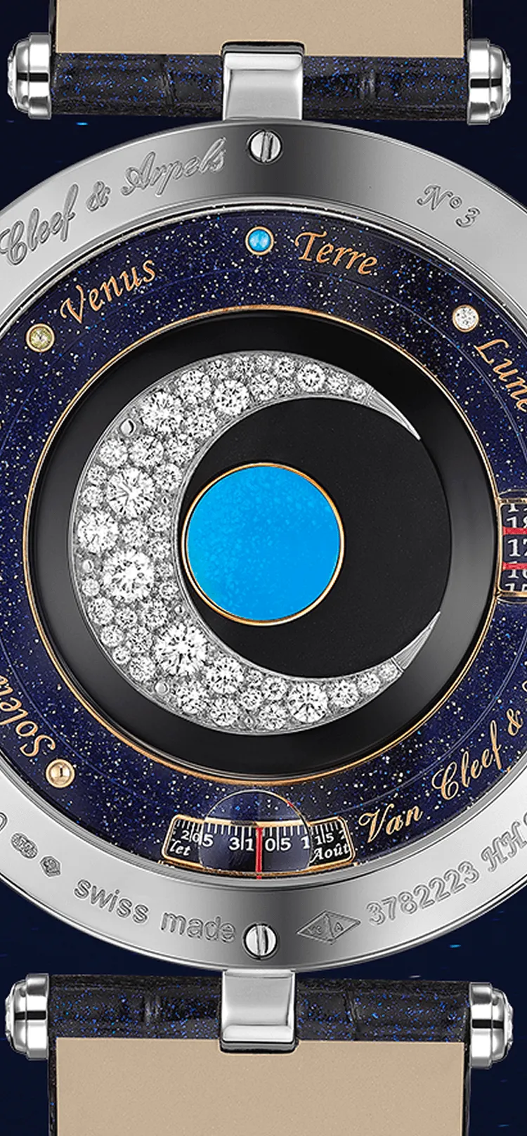 Van Cleef & Arpels 梵克雅寶首度呈獻女裝款式 Midnight Planétarium 腕錶,令 Poetic Astronomy 詩意星象系列更添柔美光華。Lady Arpels Planétarium 腕錶的細膩美學別具一格,搭載專為世家研發的自動機芯,精細展現太陽及其附近的行星:水星、金星及地球,後者更有其衛星月球相伴。