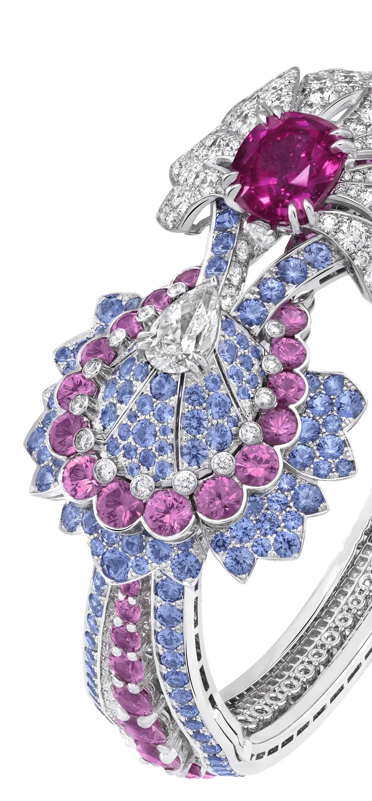 白K金,1顆5.59克拉的枕形切割粉紅色藍寶石,1顆1.13克拉的 EVVS2 級梨形鑽石,藍色及粉紅色藍寶石,白色珍珠母貝,鑽石,瑞士石英機芯,獨有臻品